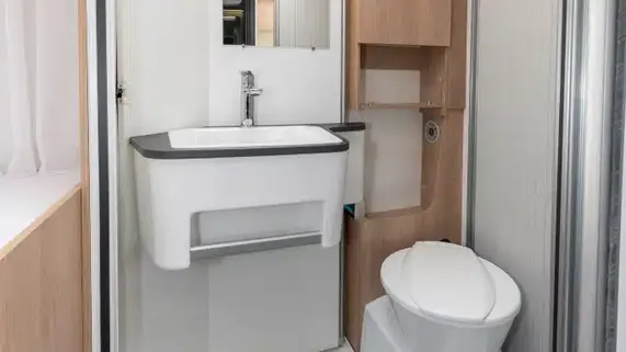 El diseño interior incluye un espacioso salón/comedor en forma de L y una cocina completamente equipada con un frigorífico de 190 litros.
